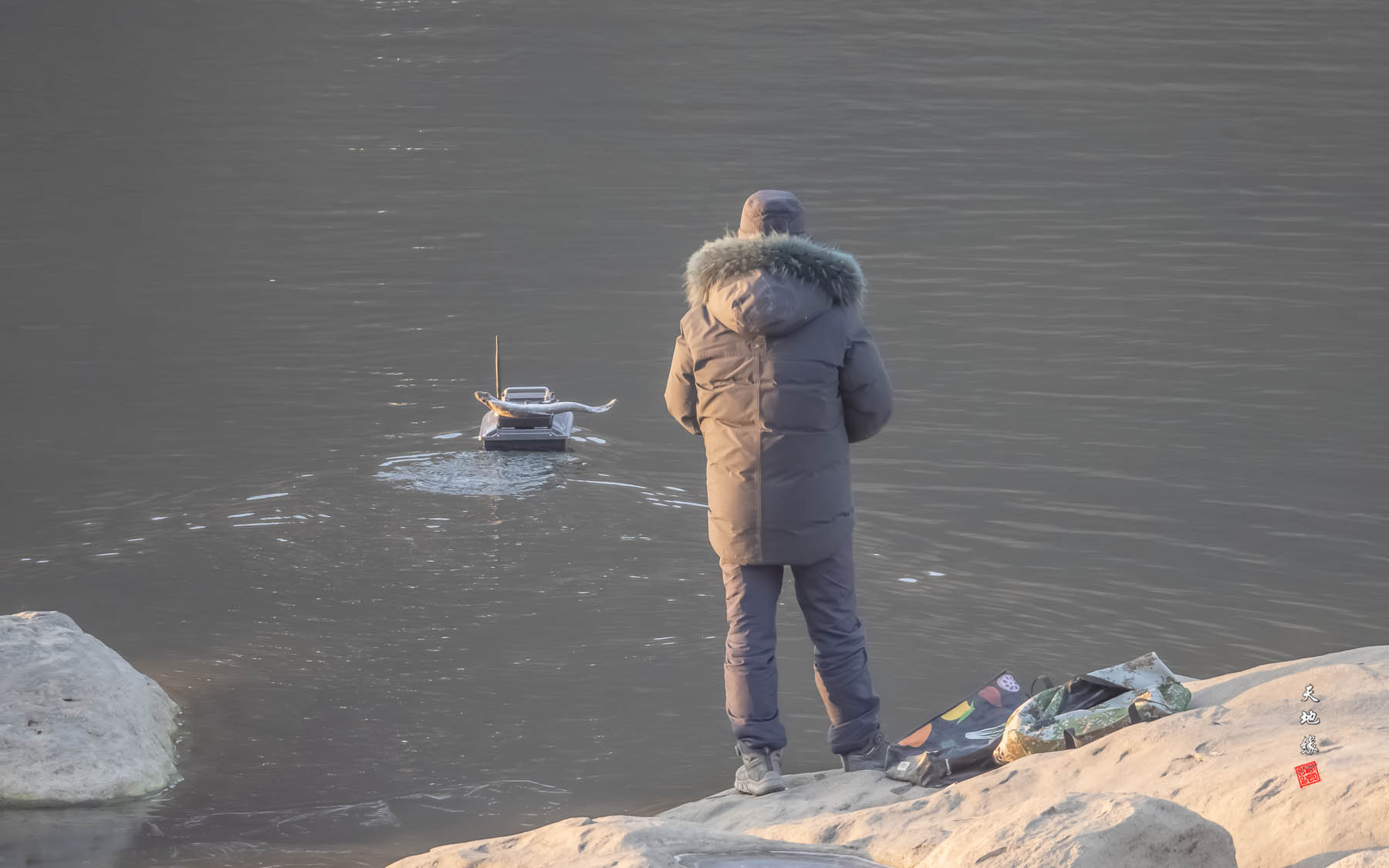 무인조정기로 고기를 실어서 강에 띄워 참수리를 유인합니다