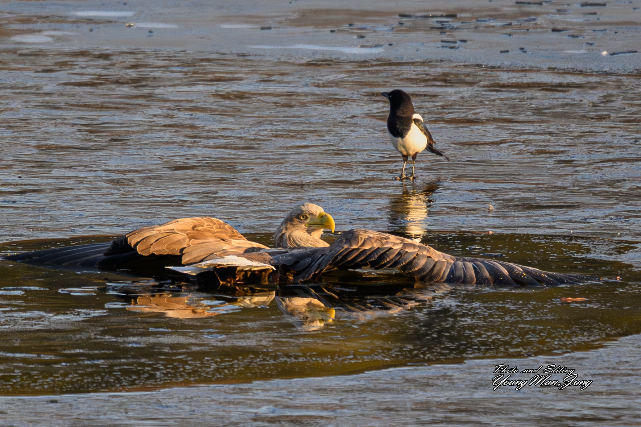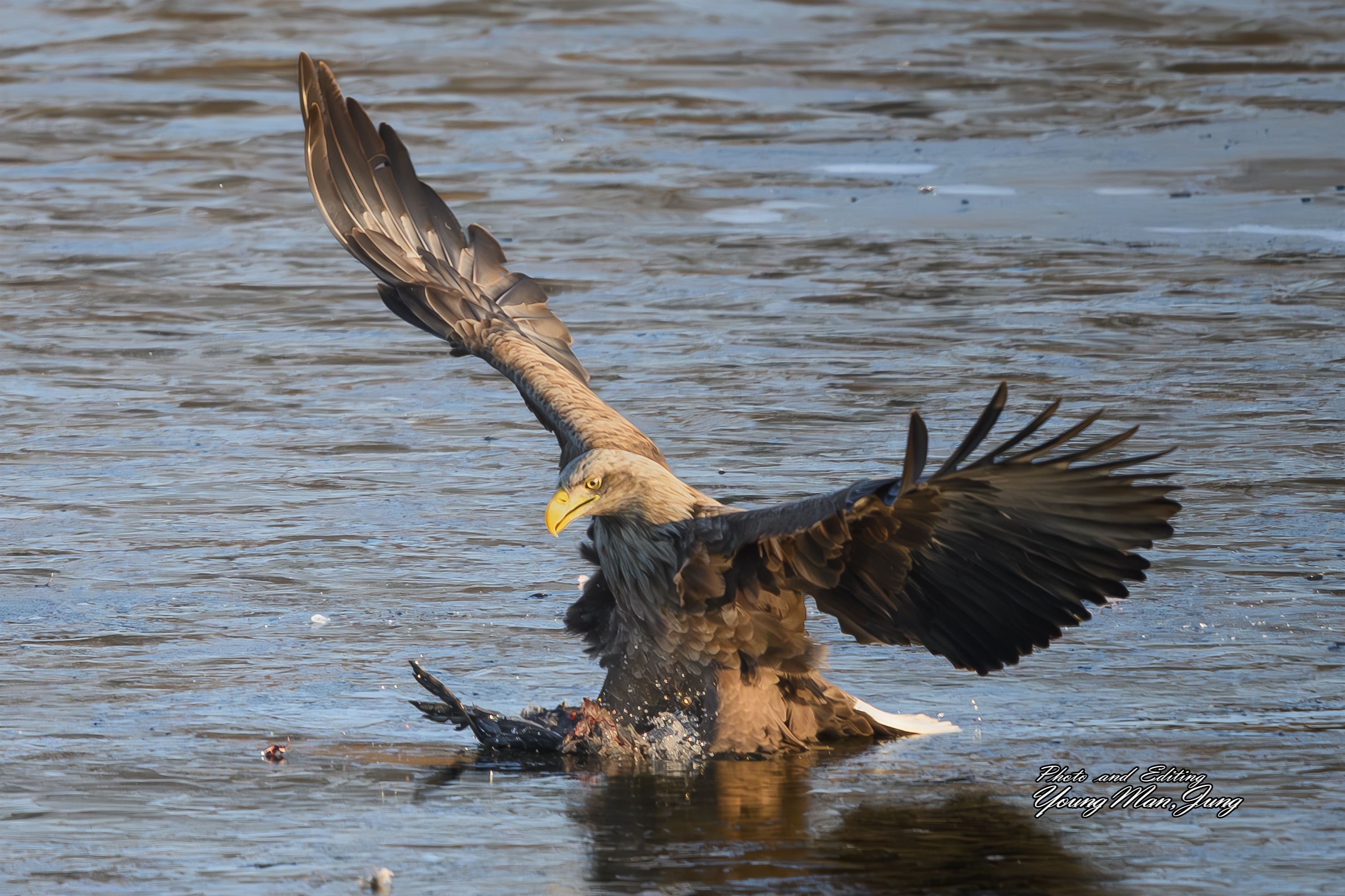 사냥한 먹이를 가지고 얼음위에 앉으려다 얼음이 깨져 빠져 버린....